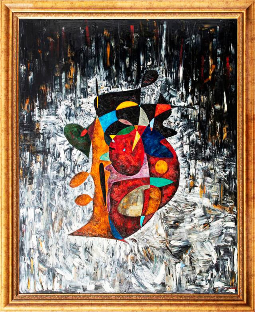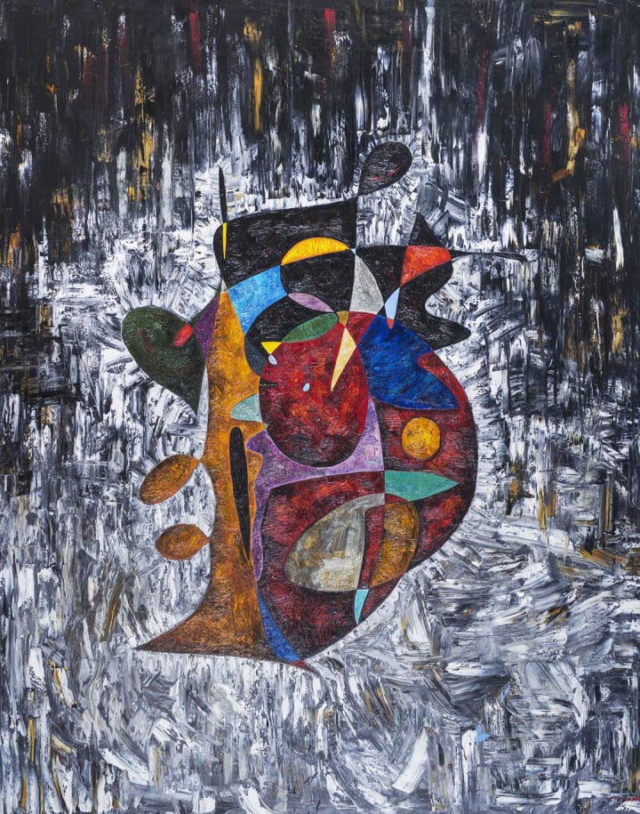 Instead, the painting unfolds as a dense field of motion surrounding a complex central structure of interlocking forms. Fragments of color—red, blue, orange, green—intersect within a biomorphic composition that feels assembled rather than drawn.