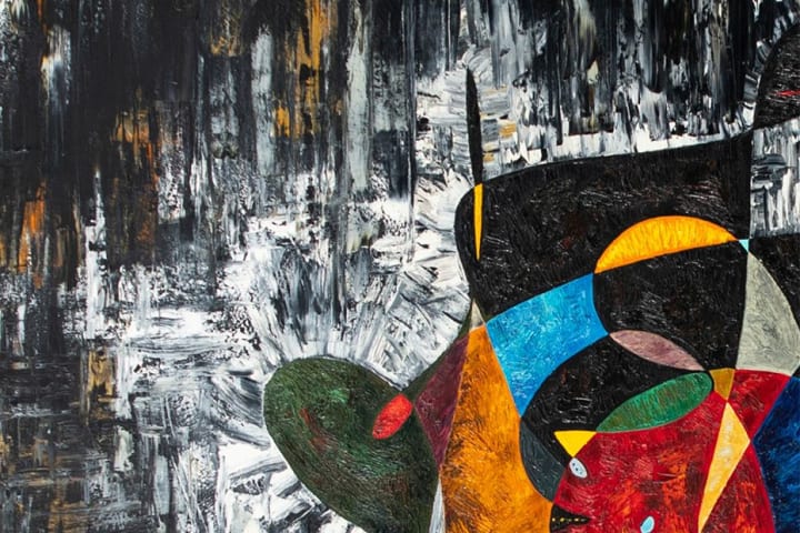 The composition appears to hold opposing forces together—color against monochrome, curved shapes against fractured space, cohesion against fragmentation.