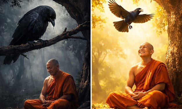 nce upon a Time, a crow was very unhappy with his life. one day he started crying while sitting on a tree. a monk was sitting under the tree, Just then, a drop of the crow's tears fell on the monk's cheek. The monk raised his head and saw that the crow was crying. The monk asked, why are you crying? The crow said, oh, wise, one. I'm very upset with my life. No one loves me.People shoot me away in disgrace and don't give me anything to eat. Everyone hates me. Death is better than such a life hearing the crow's words.