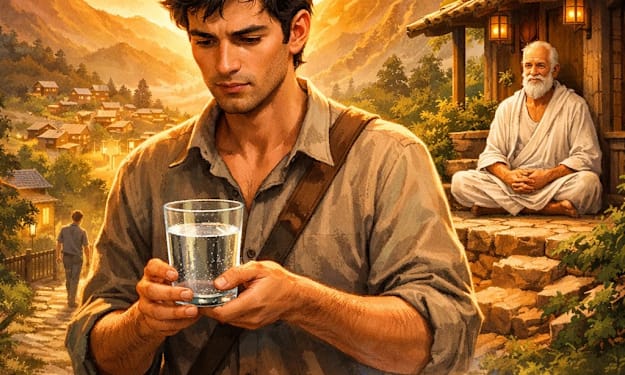 His mind was always full of thoughts All day long. Different thoughts came and went, and these thoughts made him feel uneasy and tired. He always felt sad about his past and worried a lot about the future. Because of these thoughts, his mind was like a storm. He couldn't feel calm, couldn't sleep well, and even forgot how to smile. One day, Marco heard about a far away Village in the Hills. People said that a wise old man lived there At man used to be a famous psychologist in the city. It helped many people in his life, and it taught them how to find peace in their minds. Now, he was old. He left a busy life of the city and started living in a quiet Village close to Nature. Sometimes he gave advice to visitors. Marco became curious and hopeful. He decided that he must go and meet that old man, He thought. Maybe this wise man can help me find peace After many days of a long and tiring Journey.Marco reached stability in the hill when he got there. He saw a small house covered with Greenery On the porch of the house. They've all sitting quietly. His eyes were closed and he looked very peaceful. Michael walked up to him and said softly. Grandfather. My mind is very restless. I cannot stop thinking I want peace in my heart. Can you help me? The old man slowly opened his eyes and gave a calm smile, He said. So you are looking for peace, Then come with me. I will give you a small task. He took Marco to his little yard. Then he filled a glass with water completely full to the top. The glass was so full that even a little shake would make the water spill. He gave the glass to model and said, Walk from here to the edge of the village and then come back. But remember, You must not spill even one drop of water. Marco looked at him with surprise, But he wanted to do his best, so he accepted the challenge. He held a glass carefully and started walking.