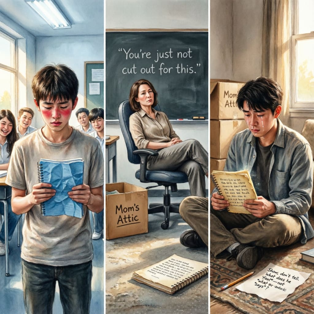 I was sitting on the floor of my tiny apartment surrounded by old boxes from my mom's house. In one of them I found that same notebook from high school. The pages were yellow now, the handwriting more childish than I remembered. I read the story I'd been so proud of that day in class. And for the first time, I didn't see it through Mrs. Thompson's eyes.