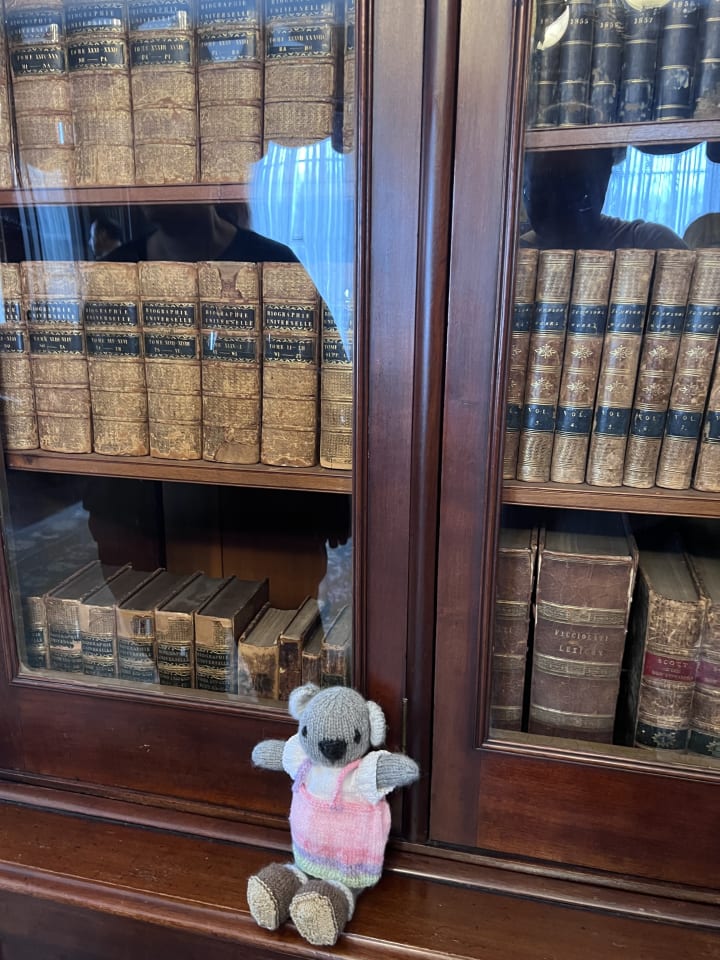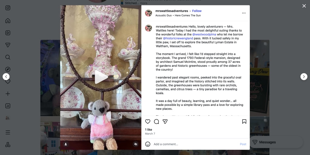 Mrs. Wattles has always believed that libraries are portals to new worlds. Sometimes those worlds live inside books, and sometimes, they’re real places waiting just beyond the doors. When she learned that the Westwood Public Library offered passes to local historic sites, her little knitted ears perked right up. She tucked the pass safely into her tiny bag, grabbed Baby Blossom for moral support, and set off for a day of exploration.