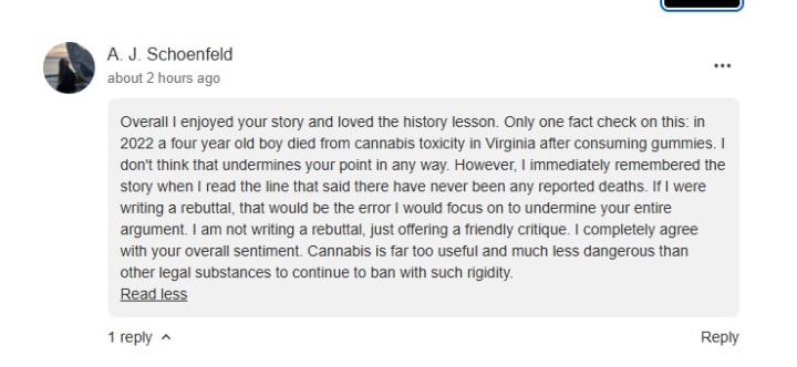 Overall I enjoyed your story and loved the history lesson. Only one fact check on this: in 2022 a four year old boy died from cannabis toxicity in Virginia after consuming gummies. I don't think that undermines your point in any way. However, I immediately remembered the story when I read the line that said there have never been any reported deaths. If I were writing a rebuttal, that would be the error I would focus on to undermine your entire argument. I am not writing a rebuttal, just offering a friendly critique. I completely agree with your overall sentiment. Cannabis is far too useful and much less dangerous than other legal substances to continue to ban with such rigidity.