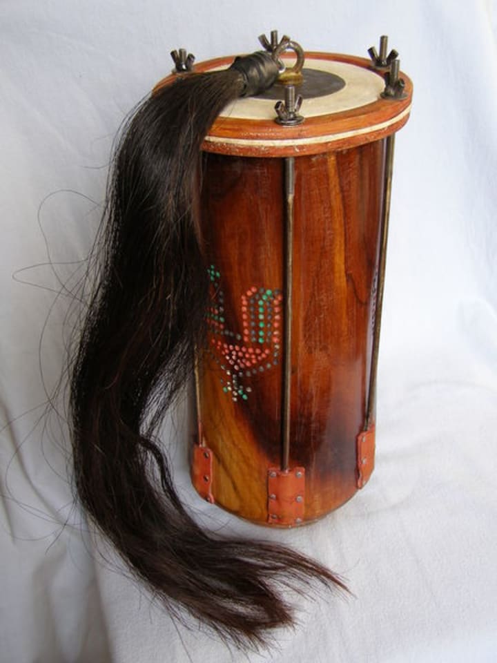 A bass instrument with a powerful sound reminiscent of the roar of a bull, hence the name. Like all folk instruments in the old days, it was made by the musicians themselves. The design is simple: a small wooden tub, the holes on both sides are covered with leather, a tuft of horsehair is attached to the upper one in the centre, like a tail.